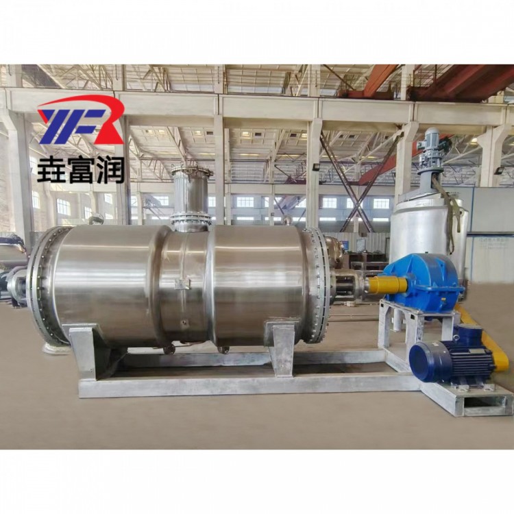 真空耙式干燥机具有结构简单,操作方便,使用周期长,性能稳定可靠,蒸汽耗量小,适用性能强,产品质量好,特别适用于不耐高温、易燃、调温下易氧化的膏状物料的干燥,该机经用户长期使用证明是一良好的干燥设备。原理:被干燥物料从壳体上方正中间加入,在不断正反转动的耙齿的搅拌下,物料轴向来回走动,与壳体内壁接触的表面不断新,受到蒸汽的间接加热,耙齿的均匀搅拌,粉碎棒的粉碎,使物料表面水分有利的排出,气化的水分经干式除尘器、湿式除尘器、冷凝器,从真空泵出口处放空。