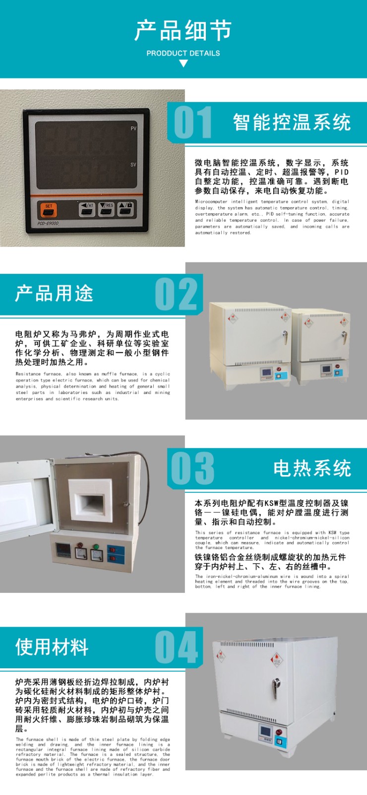 2.电阻炉配有KSW型温度控制器及镍铬―镍硅电偶,能对炉膛温度进行测量、指示和自动控制。