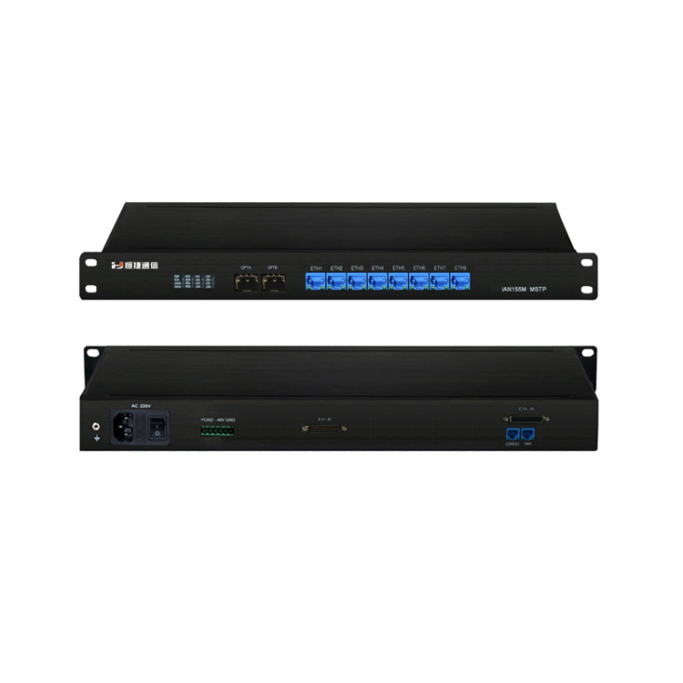 HJ-iAN155光端机是STM-1级别的多业务SDH(Synchronous Digital Hierarchy)光传输系统。具有两路STM-1等级群路光口,实现E1和基于GFP封装的以太网等业务的复用和传输。支持全时隙交叉功能,上下电路方便灵活,可作为上下电路复用器或终端复用器,组建点对点、链网、环网网络。