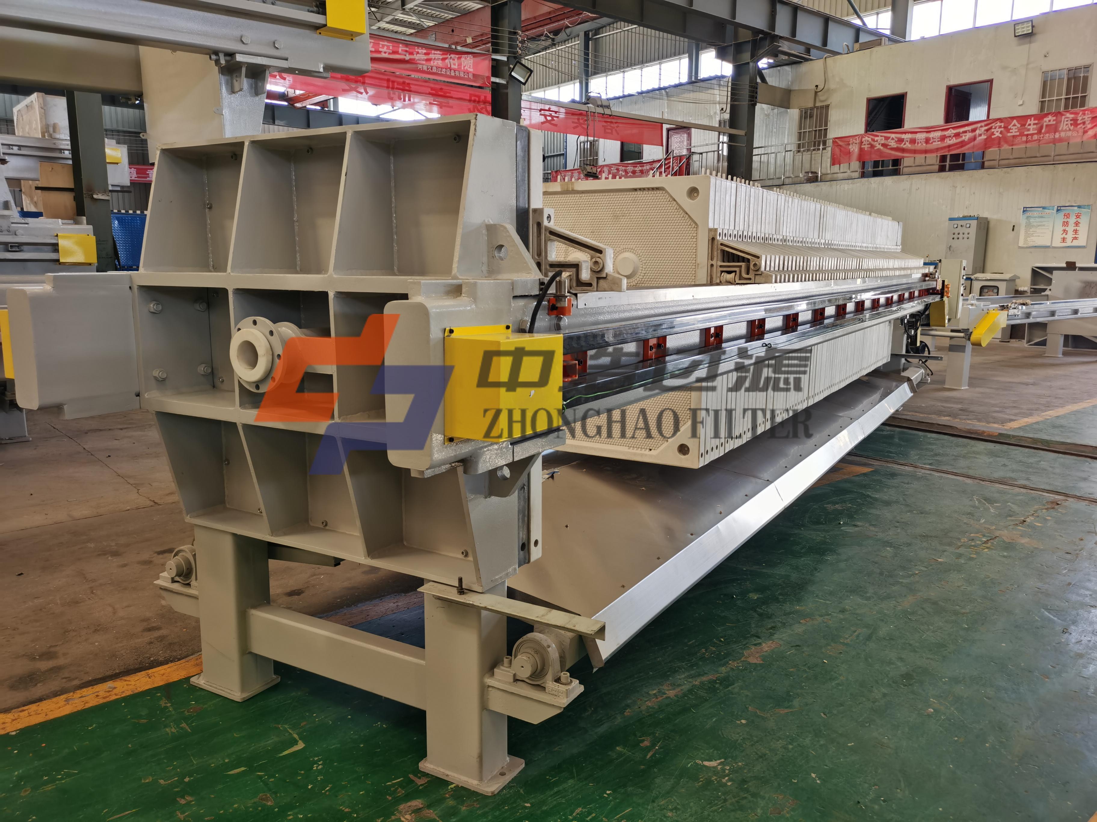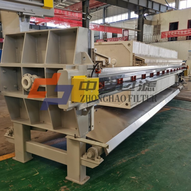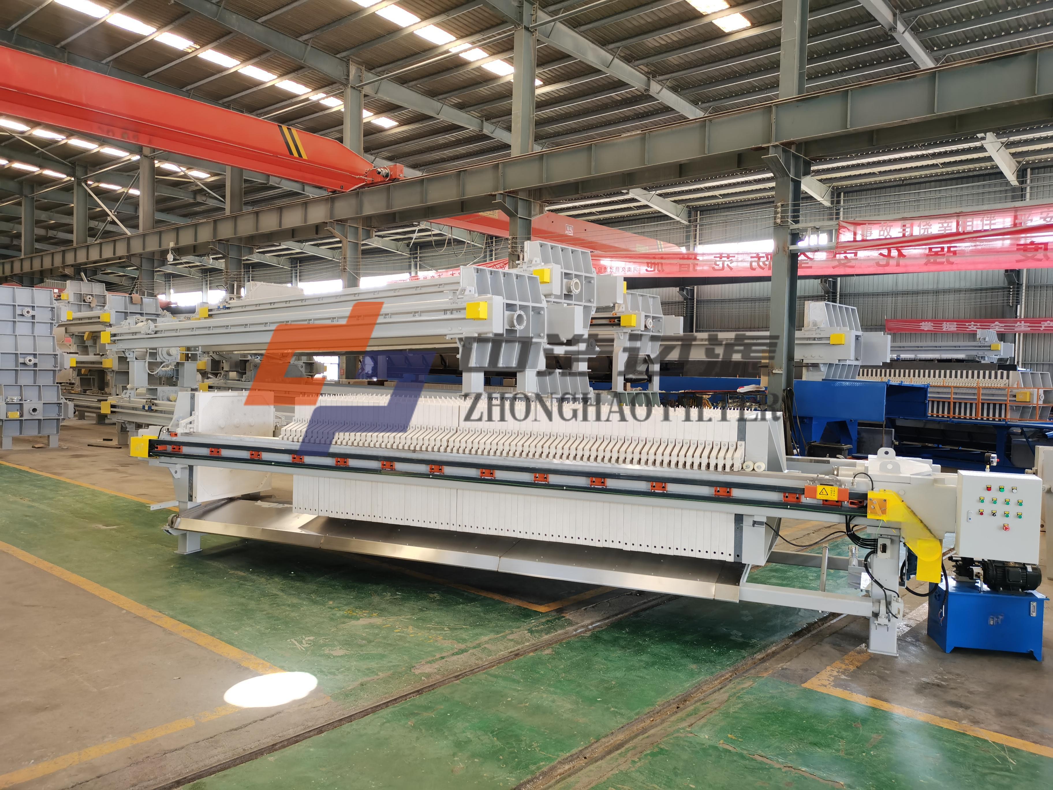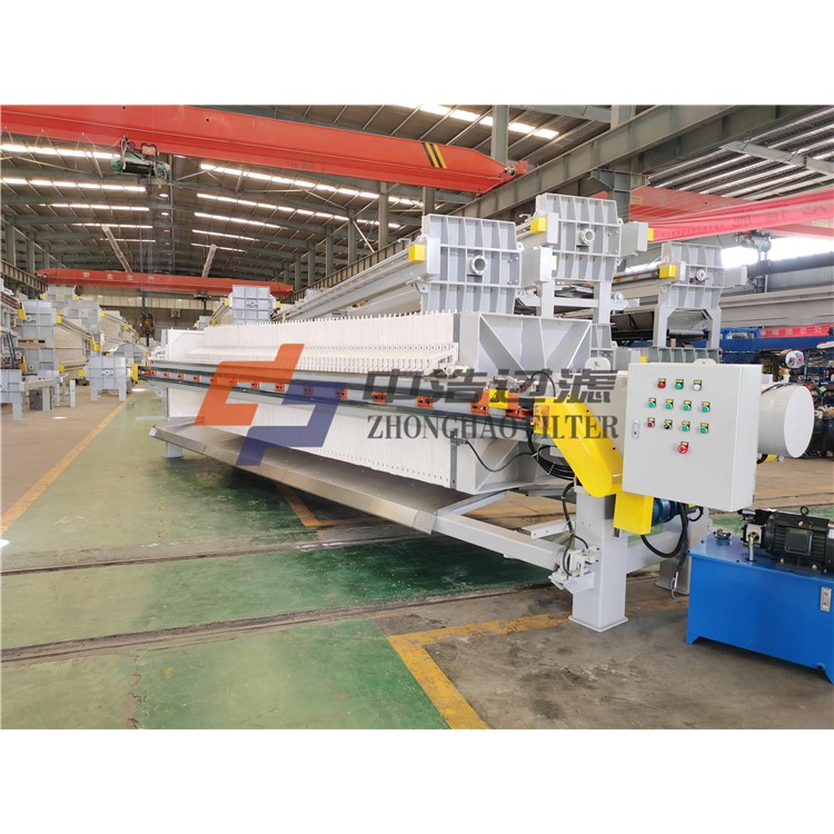 全自动水冲洗压滤机是采用PLC控制原理制造的压滤机,整机采用PLC控制,能使压机实现自动进料、自动松开滤板、自动拉开滤板卸料、自动压榨、自动清洗滤布等功能。并可以留有远程控制接口,能实现远程自动监测或操作控制。