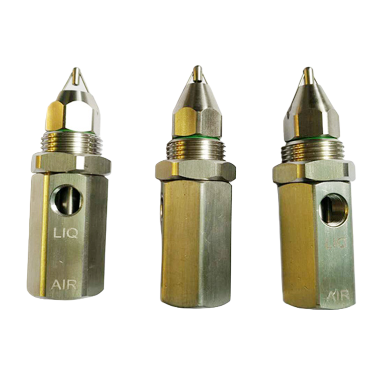 超声波雾化喷嘴,雾化过程分为二个阶段,第一阶段液体先与压缩空气混合产生细小的雾化液滴喷出喷嘴外,当雾化的液滴撞击到喷头前端的超音波产生器立即再微雾化成更小的液滴称为第二阶段。