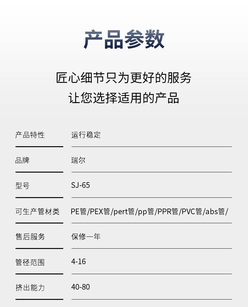 | 可生产管材类型 | PE管、PEX管、pert管、pp管、PPR管、PVC管、abs管、铝塑复合管、其他 | |