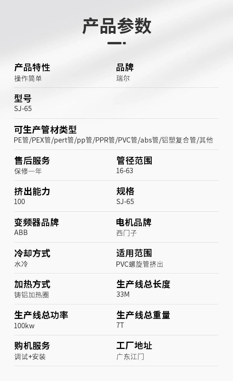 | 可生产管材类型 | PE管、PEX管、pert管、pp管、PPR管、PVC管、abs管、铝塑复合管、其他 | |