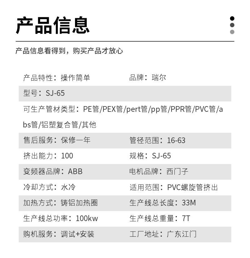 | 可生产管材类型 | PE管、PEX管、pert管、pp管、PPR管、PVC管、abs管、铝塑复合管、其他 | |