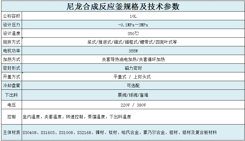 尼龙合成反应釜的结构形式、压力高低、加热方式、搅拌桨形式可根据用户工艺技术条件需要进行设计制造,选用材料可根据用户反映介质需要,制造各种不锈钢、钛、镍以及碳钢 反应釜、反应塔、反应罐、冷凝器、换热器、储罐等以及非标准化工设备。可根据用户技术条件生产磁力偶合器与反应容器配套,其大小可以任配。