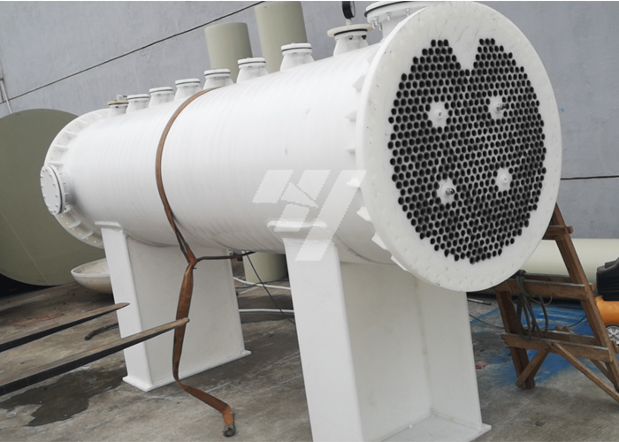 全塑、固定、管板、列管式换热器,华阳防腐设备系用石墨改性聚丙烯塑料制成,壳体、管板、封头法兰及接管等零部件均采用纯聚丙烯塑料制成。