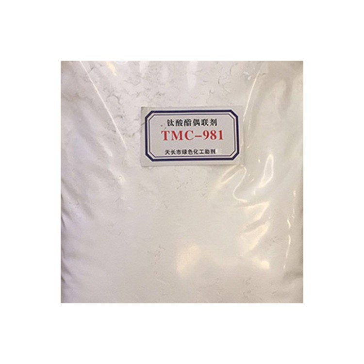 TMC-981 是我厂开发的新型粉状钛酸酯偶联剂,本产品为粉状颗粒,易于分 装,便于称量,价格较低,且稳定性高,克服了铝系偶联剂耐温差,挤出过程中 会冒烟等缺点,适用于非极性、半极性聚合物。