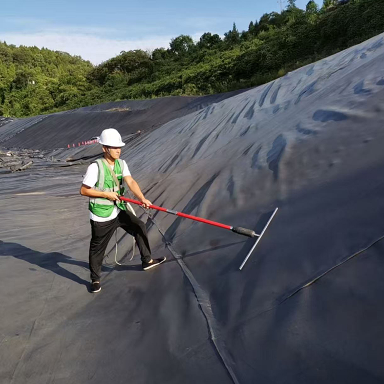 湖北省襄阳市某猪养殖基地氧化塘项目,该氧化塘容量47000立方米,单层2.0mm土工膜防渗,土工膜铺设焊接完成后进行防渗膜完整性检测,采用电火花检测法,发现接卸损伤渗漏点4处,经焊接技术员焊接修复后通过复测。