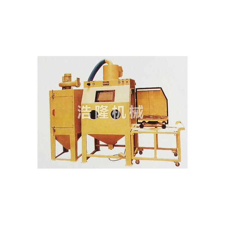 HLK-FA手动推车转盘喷砂机特点: 1、具备转台式喷砂机的特点; 2、特殊轨道推车设计,可把重型工件吊放在上面,十分方便、省力; 3、推车转盘,可根据客户要求加固; 4、可根据客户需求,选择手动或自动转台; 5、引进“日本技术”而设计的上旋风分离系统提升喷砂效率,可微调分离120#-320#的微小磨料,大大的节省了磨料; 适应范围: 主要适用于大型、较大型和较重型工件的喷砂:如各类模具、电脑外壳模具、重力压力模等大型工件的喷砂。