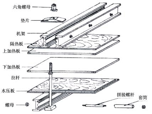 ②将下机架放置在被修补处下面(均称),在机架上,胶带下放置水压板,下加热板(在被修补处正上方);