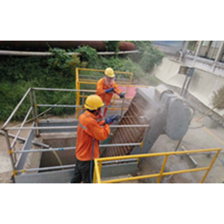 (3)无环境污染 由于高压水射流清洗是以清水为介质,因而水射流清洗不像喷砂抛丸及简单的机械清洗那样产生大量粉尘,污染大气环境,损害人体健康;也不像有些化学清洗那样,产生大量废液污染河道、土质和水质。以清水为介质水射流,无臭、无味、喷出的射流雾化后,还可降低作业区的空气粉尘浓度,可使大气粉尘由其他方法的80mg/m3³降低到国家规定的标准2mg/m3³以下,因此不会造成任何污染。