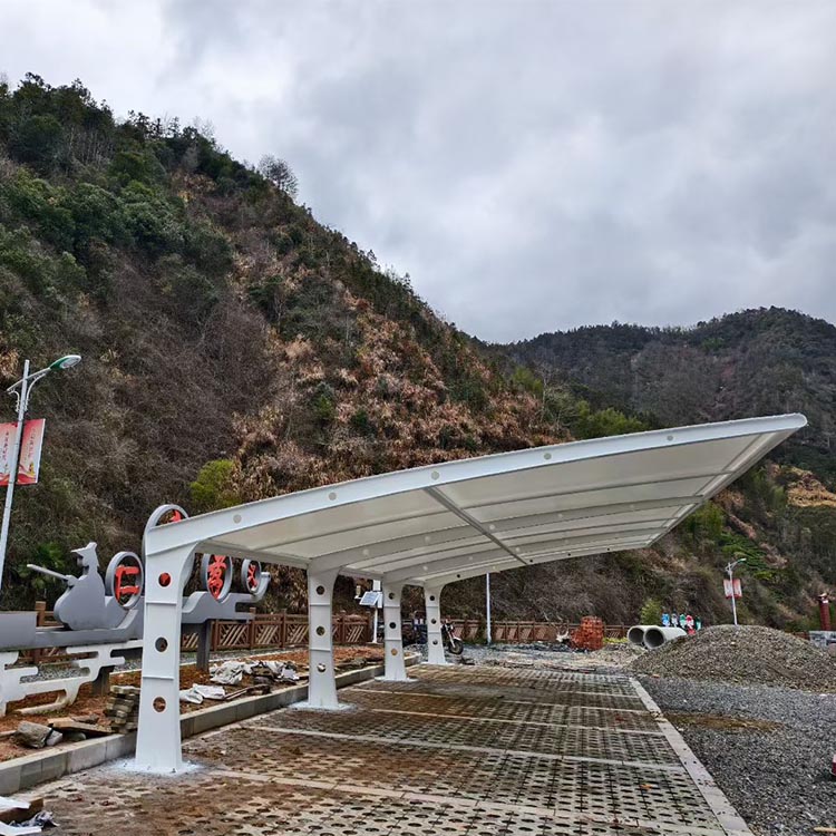 膜结构车棚,它是一种以高强柔性膜材为顶,配合钢结构 / 拉索体系,通过张拉或骨架支撑形成稳定曲面的现代化停车防护设施,兼具功能与景观价值。