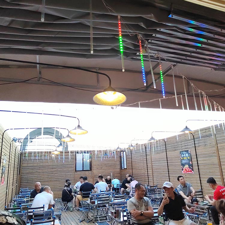 电动伸缩雨棚:适合 10m + 大跨度、高频开合,一键操作,智能联动。