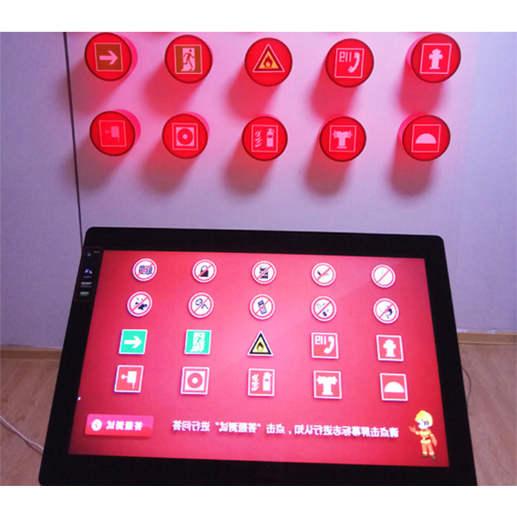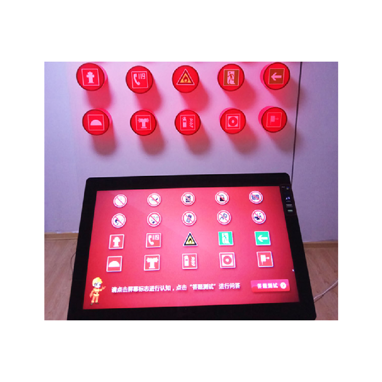 本套系统是通过触摸一体机与控制器、消防标志灯箱(20个)共同组成,体验者通过在触摸屏上触摸消防标志进行动画学习认识,墙面相应的标志灯箱也会伴随闪烁。在学习后可进行答题测试环节,系统会随机抽取5个标志进行提问,答对得分,答错不扣分,并提示正确标志灯箱进行闪烁,增加了互动学习趣味。
