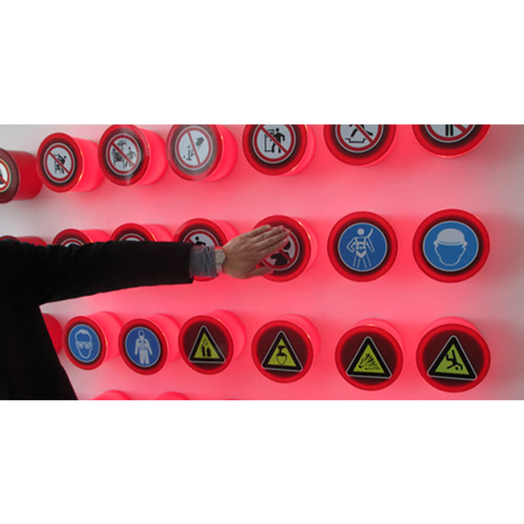 安装应用于安全展厅内的一面隔板墙上,分布并排列好红色圆形标志小灯箱,并利用电脑和电视机或触摸一体机共同组建完成。选择不同的触发版本,通过体验者触摸墙面上不同的安全标志小灯箱,或者点击触摸屏图票,就会进行播放相应动画演示视频介绍,或者是闪灯,广泛应用于安全展厅、安全体验室等。