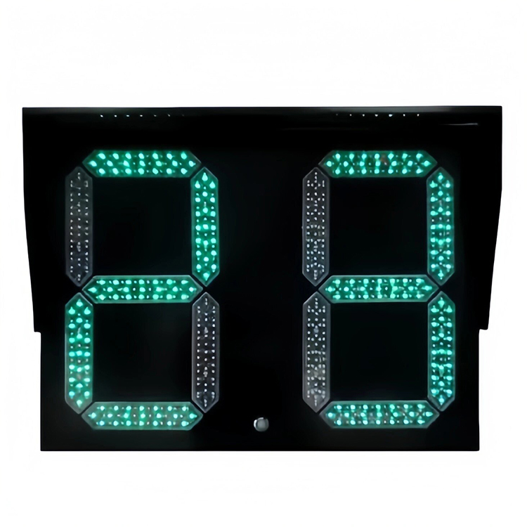 两位倒计时红黄绿数字显示,笔画段样式,十位采用红倒计时显示,个位采用红黄绿倒计时显示,倒计时器通过倒计时数提醒车辆与行人等待时间。