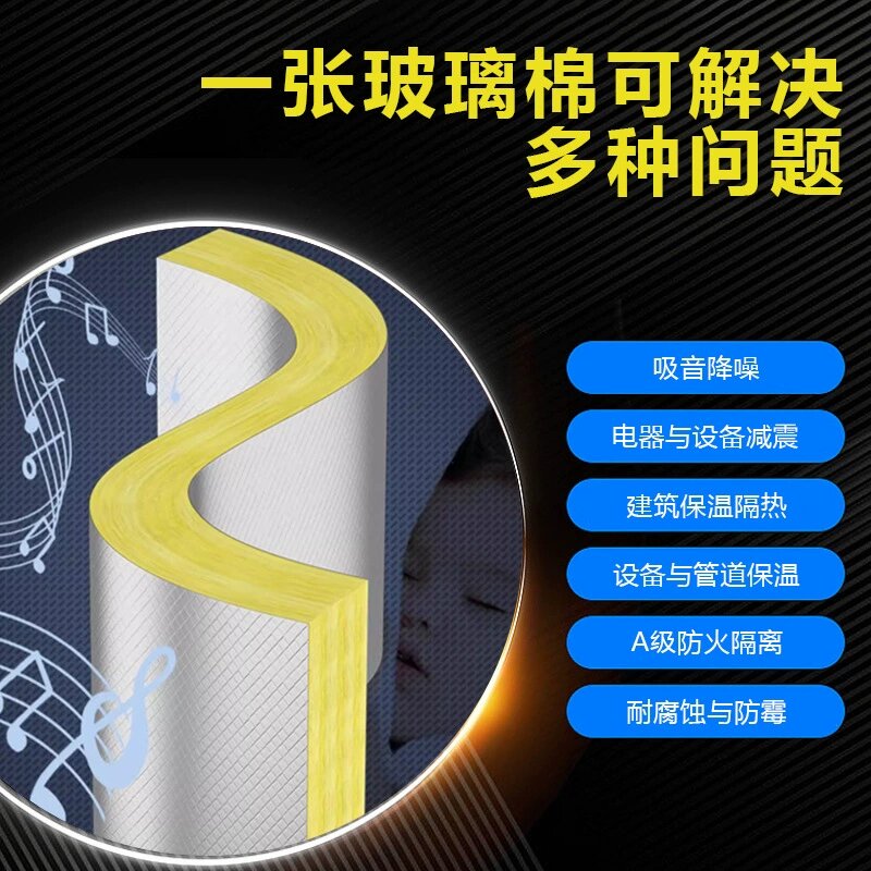 • 玻璃棉系列(玻璃棉板、玻璃棉卷毡):以石英砂、石灰石等无机矿物为原料,内部形成交错纤维多孔结构,导热系数 0.034-0.044W/(m・K),吸声系数达 0.85(1000Hz),兼具保温与吸音双重功能,适合建筑墙体、屋面、风管系统等大面积铺设,在商业综合体、船舶管道、工业排气管道中应用广泛。