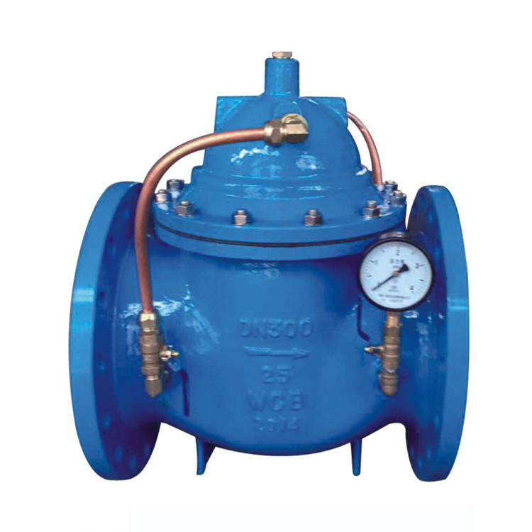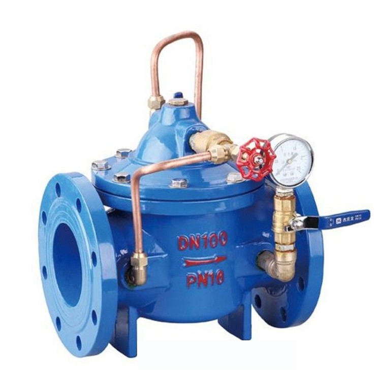 该阀门由主阀、单向阀、针阀、球阀、微型过滤器和压力表组成水力控制接管系统。进水时,水流经微型过滤器、针阀和单向阀进入主阀控制室,推动主阀开启;停泵时,回流水经球阀进入控制室,单向阀阻止回流水流出,主阀缓慢关闭以消除水锤。
