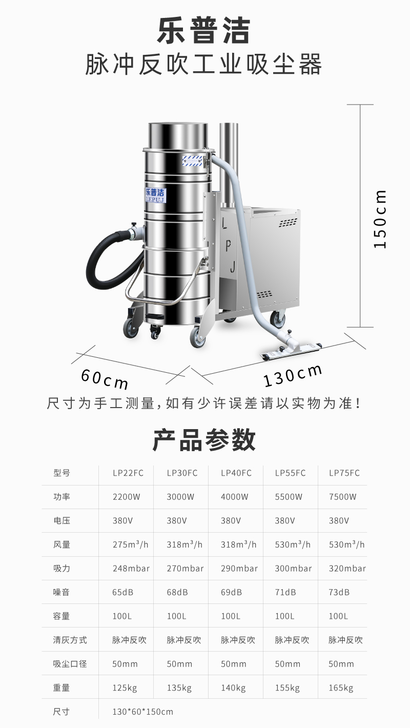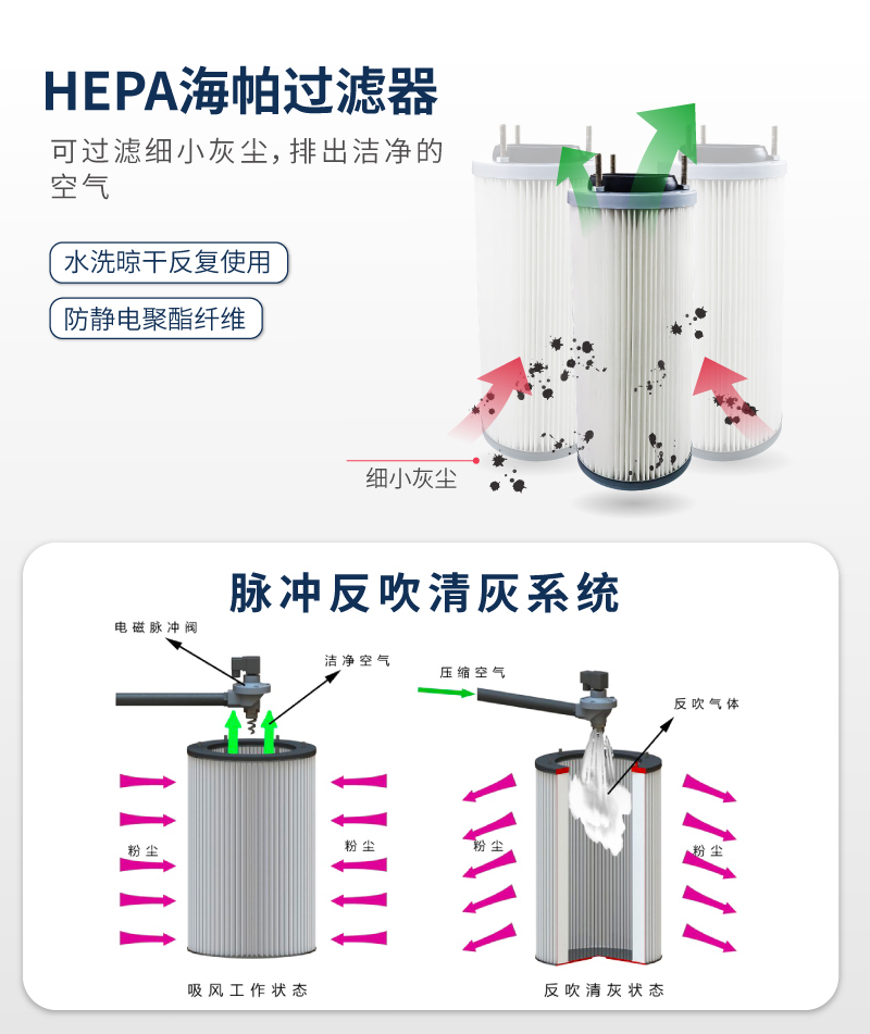 乐普洁脉冲反吹工业吸尘器特点: