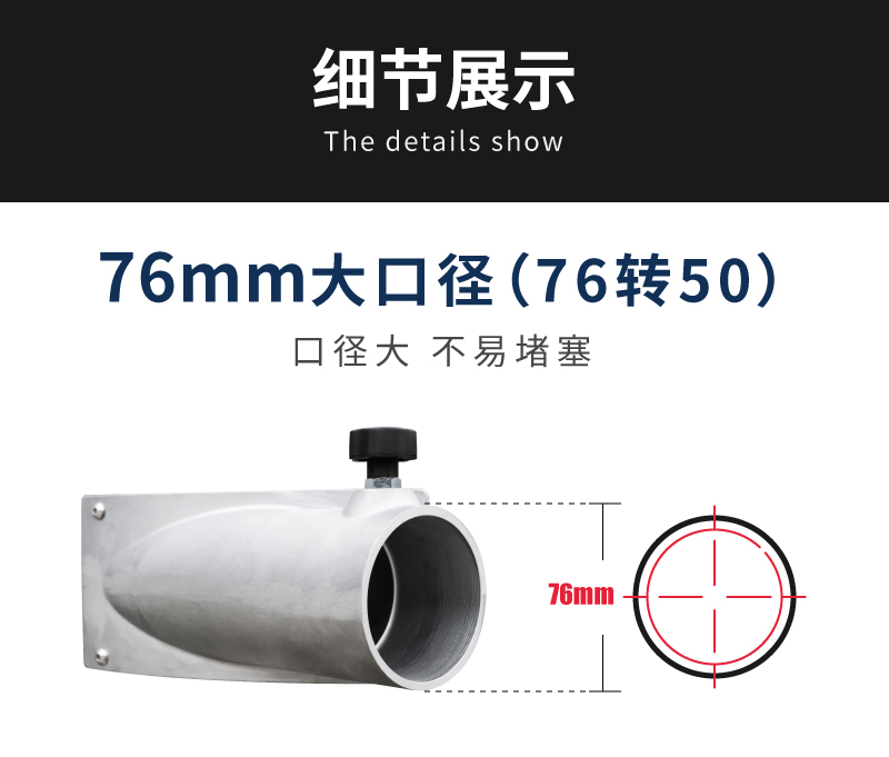 5.76mm转50mm铝铸吸口配合不锈钢变径,软管不打结,内置3个滤筒设计,聚酯纤维覆膜材质。