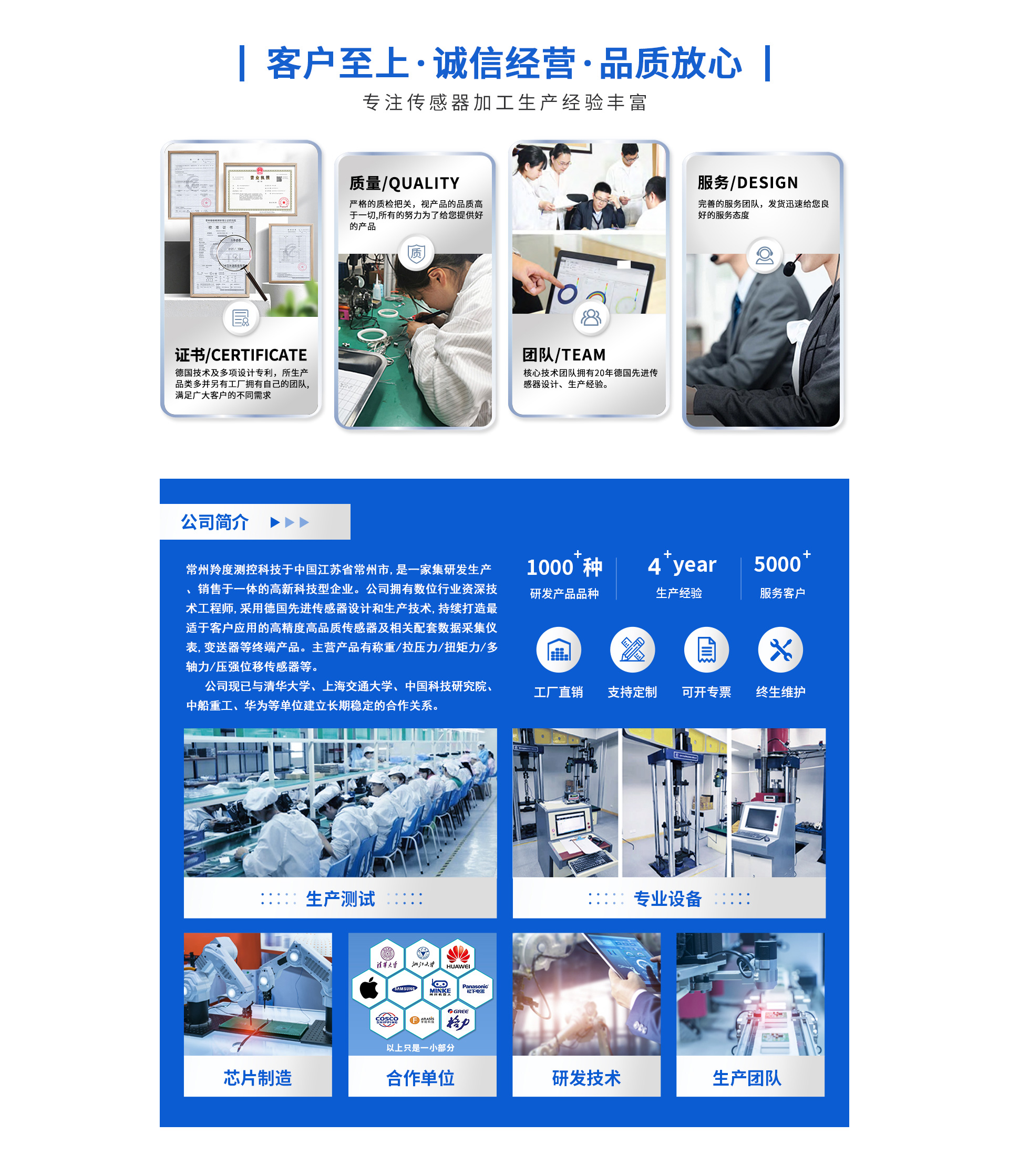常州羚度测控科技于中国江苏省常州市,是一家集研发,生产、销售于一体的高新科技型企业。拥有数位行业资深技术工程师,采用德国先进传感器设计和生产技术,持续打造最适于客户应用的高精度高品质传感器及相关配套数据采集仪表,变送器等终端产品。主营产品有称重/拉压力/扭矩力/多轴力/压强位移传感器等。现已与清华大学、上海交通大学、中国科技研究院、中船重工、华为等单位建立长期稳定的合作关系。