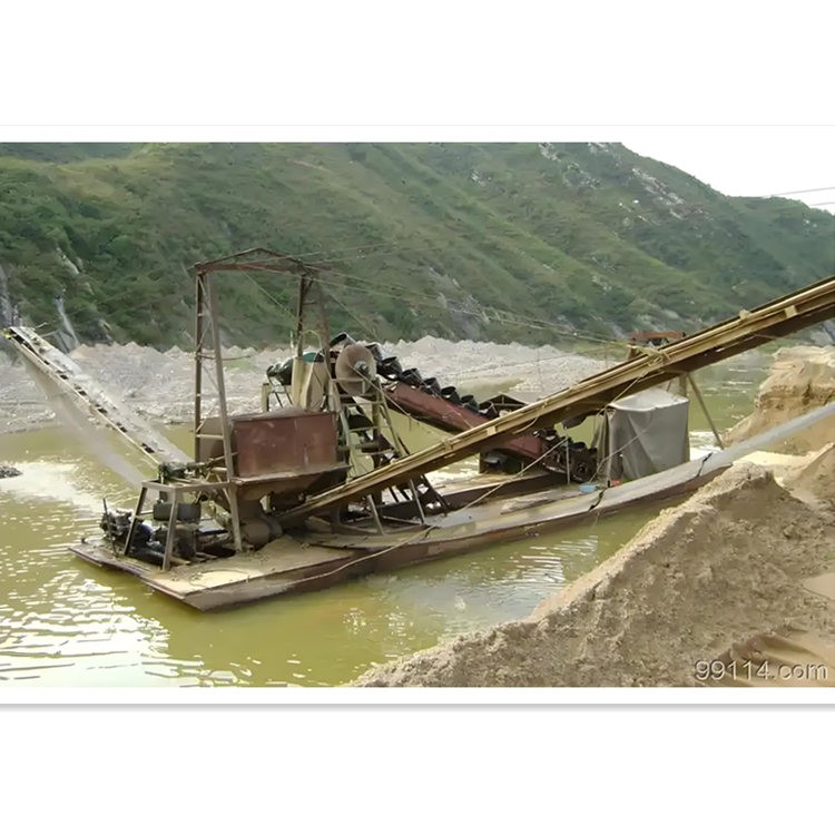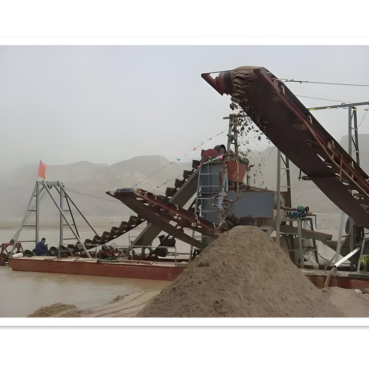 链斗挖沙船的工作原理本质是一个由链条连接的水上驱动“斗轮”和一个水下从动“斗轮”在动力的驱动下形成连续运转运转的链条带动挖斗切入河床挖取物料提升至水面以上在顶部翻转卸料物料进入分离筛筛分,筛分后的物料通过滑料斗进入传送带运输船转运或者疏浚泵排放空斗返回水下继续挖掘形成一个效率高、连续的物料挖掘、提升筛分和输送闭环。其核心优势在于对多种质的适应性和连续作业能力尤其适合需要准确挖掘轮廓的工程和开采级配砂石的场合。