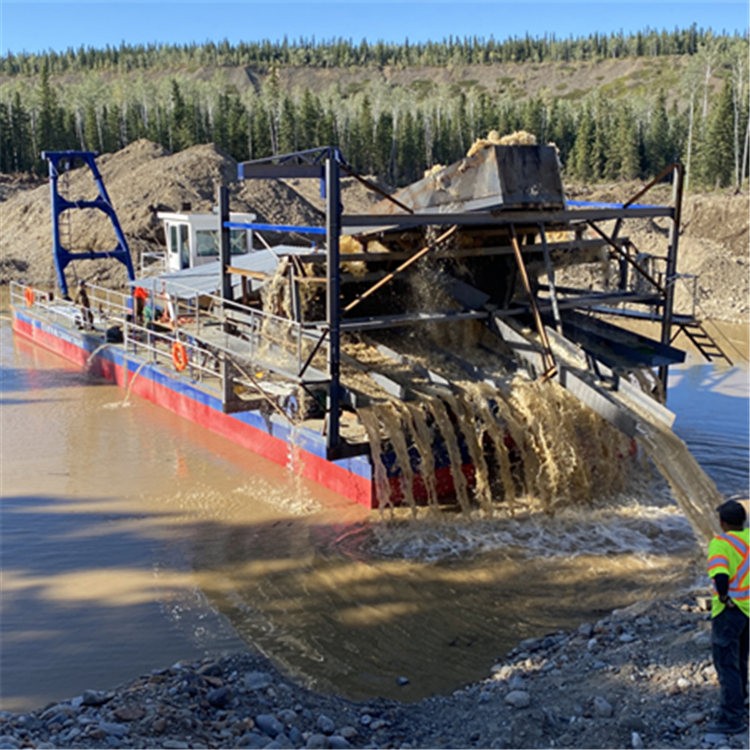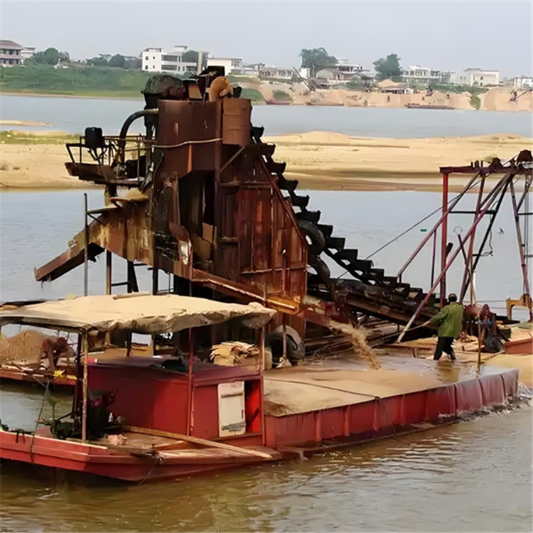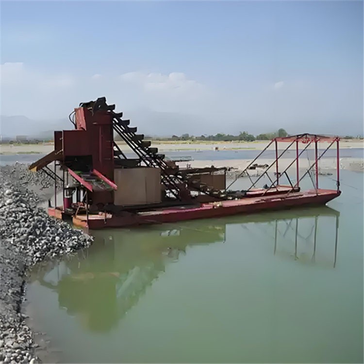 挖斗采金船是一种集挖掘、提升、筛分、洗矿、重力选矿富集于一体的移动式水上采金设备,主要用于从河床、古河道或浅水沉积砂矿中开采砂金。其核心功能在于连续、快速地从砂砾中分离并富集黄金颗粒。