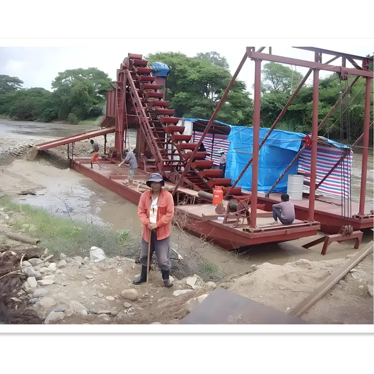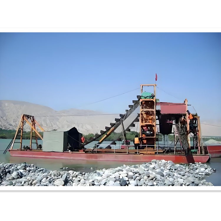 挖斗采金船是一种集挖掘、提升、筛分、洗矿、重力选矿富集于一体的移动式水上采金设备,主要用于从河床、古河道或浅水沉积砂矿中开采砂金。其核心功能在于连续、快速地从砂砾中分离并富集黄金颗粒。