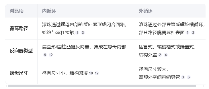 注:实际选型需综合负载、速度、精度及安装空间要求,高精度场景推荐内循环,重载低速场景可选外循环。