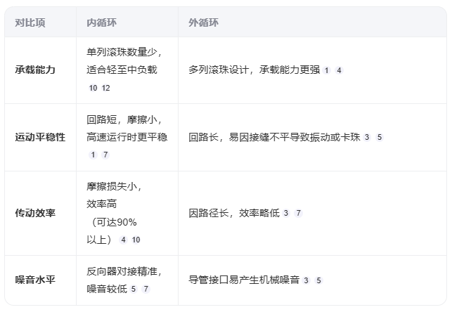 内循环优势:结构紧凑、高精度、低噪音;劣势:负载能力有限,反向器加工复杂。