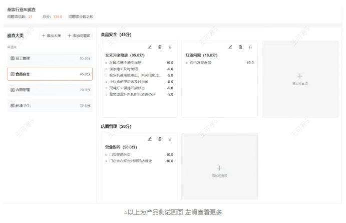 过去依靠人工巡查,李督导40分钟才能查完一家店,且由于负责门店多,只能进行抽查,容易有遗漏。现在 “AI 巡查员” 7×24 小时无间断帮助巡店,大模型自动检测15项核心指标,覆盖门店环境、食品卫生、消防安全等场景,不仅单次巡查时效提升37%,问题发现频次更是提升了300%。