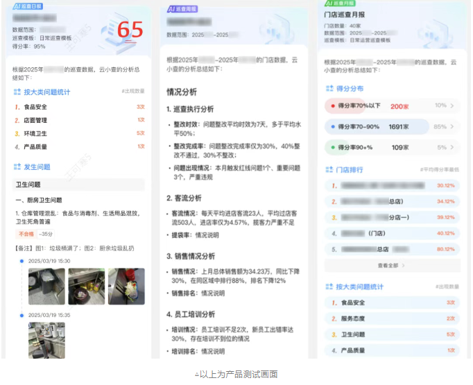 “AI 巡查员” 汇总大量巡查数据,大模型分析生成多维度运营报告。报告内容不仅能帮稽核部门精准锁定高风险门店,还能为市场部提供运营优化建议,助力门店实现精准运营。