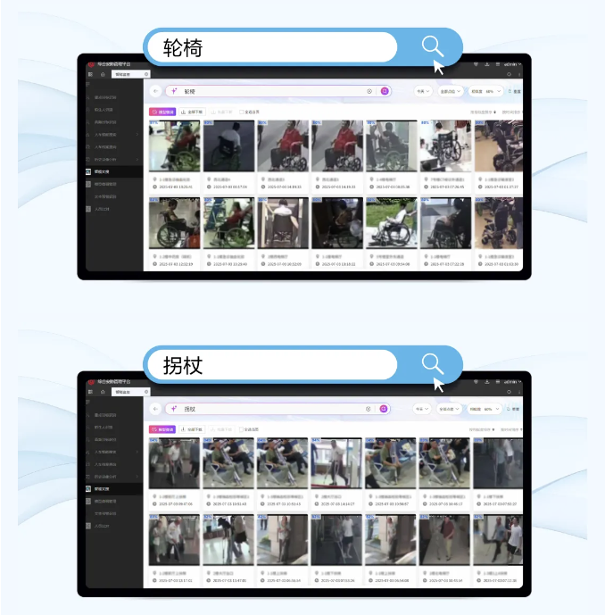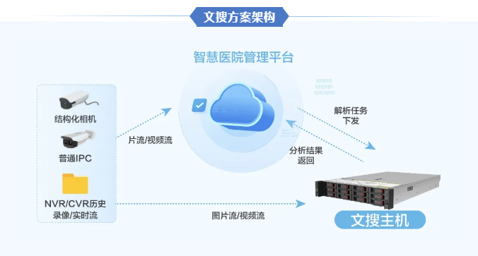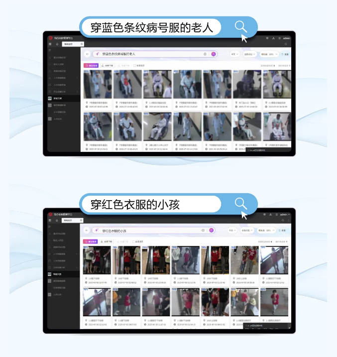 本项目对院区内普通监控设备实现文搜智能分析,结合医院院区管理平台,快速检索关联视频,为劝导工作提供有力依据,高效管理不文明或不规范行为;当老人、儿童意外走失,输入其衣着等特征,迅速搜索失联人员动向,多方协作,快速找回……文搜在医院多场景的应用,有效提升院区安全管控的响应速度与管理水平 ,助力医院构筑起坚实的安全防线。