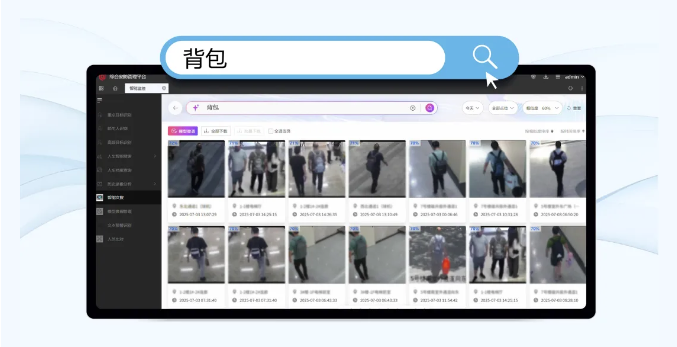 当陪诊家属物品丢失后,安保人员可根据搜索丢失物品(如背包、雨伞等),查看符合要求的物品画面,高效定位匹配的目标,结合图搜功能,可进一步明确具体位置,辅助家属快速找到背包。