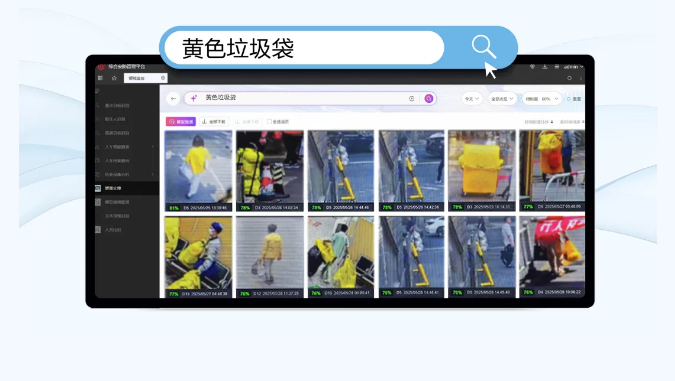 医疗废弃物(黄色垃圾袋形态/黄色废弃物运输车)在运输过程中需规范化管理,工作人员在在文搜界面输入“黄色垃圾袋”等文字,搜索医疗废弃物在不同区域搬运运输情况,定位录像监控,查看运输是否规范。