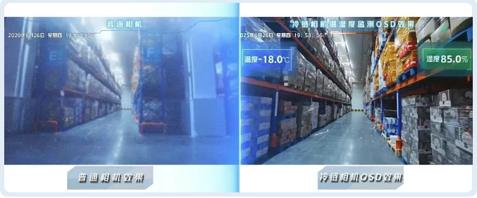 “不怕冷”的设备,还有海康威视冷链相机,内置加热模块,在-35℃的环境里,镜头也不会起雾,同时搭配温湿度传感器,看清冷库内货品情况的同时,还能实时感知温湿度。