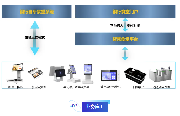 一方面通过食堂消费服务的智能化升级改造,帮助客户提升食堂消费体验;另一方面通过食堂消费嵌入支付结算业务,扩展金融服务,将金融服务和金融科技融入到客户的日常消费场景中。