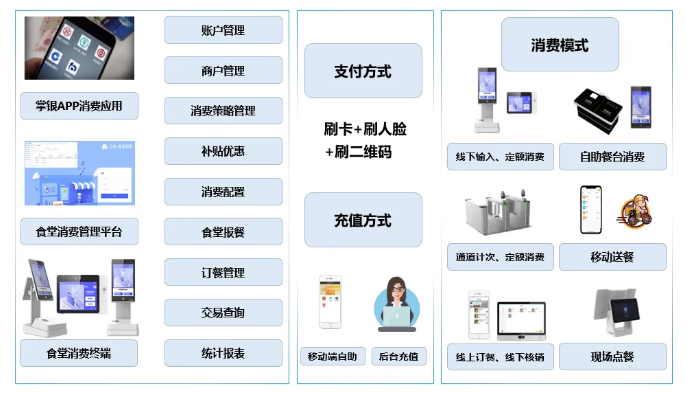 平台应用功能丰富,包括账户管理、消费配置、补贴优惠、交易查询、统计报表等;支持刷卡、扫码、刷脸多种支付方式;有输入金额、定额、计次等消费模式,同时支持移动送餐、订餐、点餐等多种模式。