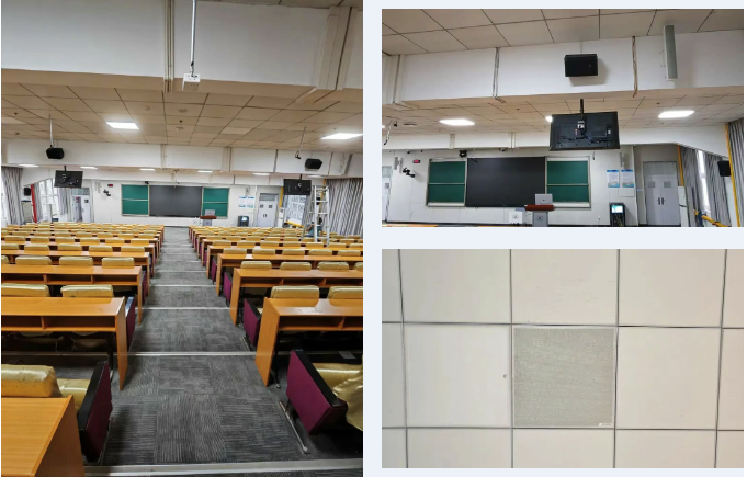 在256㎡的大阶梯教室中,讲台区配置1台128mic网络阵列麦克风,嵌入天花板安装,不改变教室原有风格。128mic的分区拾音、远距拾音等功能,满足教师无接触、无束缚拾音需求,解放双手、随意走动都可精准拾音。扩音端搭配80w全频音箱,扩音效果立体饱满,整间教室任意角落都能清晰触达。