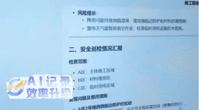 除了能“看清楚”,工地安全生产检查记录仪还能“写得规范”。巡检过程中,要是遇到问题,小唐可以直接“告诉”记录仪,让它“记住”这些讲话内容,通过后台的海康威视多模态大模型,结合轨迹信息,这些讲话内容能自动转化为格式标准、内容详实的巡检文字日志。“以前全靠手写记录,现在几分钟就能整理完成,准确又省心!”小唐说。