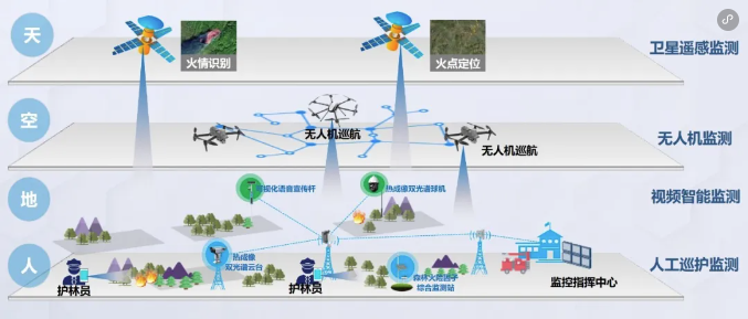 构建“天空地人”立体化监测网络,对火险因子、火情要素进行立体化、全方位监测,实现监测对象广泛覆盖、监测手段多样融合、监测数据高效采集。