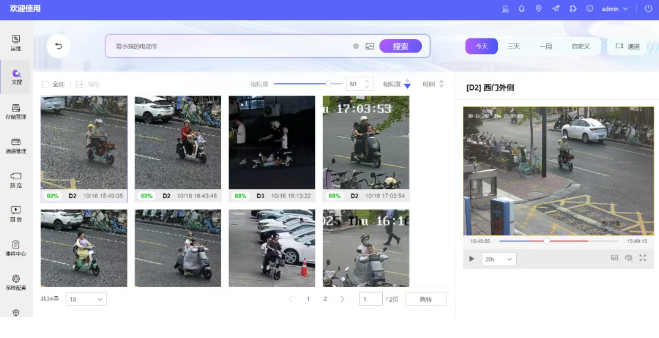 与传统存储只能“存视频”相比,文搜CVR利用多模态大模型,可以实现自然语言与视频图像的跨模态信息检索应用。用户只需输入一句话、一个词,就能在海量数据中快速搜索人、车、动物、物品、行为特征等目标,实现“以文搜图”。也可以上传目标的图片,通过“以图搜图”功能来搜索目标视频与位置。文搜+图搜,让目标无处遁形!