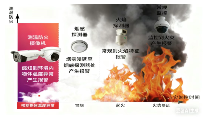 火灾发展必经:温度异常 → 冒烟 → 明火 → 蔓延。传统手段在“冒烟”后才报警,而热成像在“温度异常”阶段即可精准识别,真正实现“灭早、灭小”。