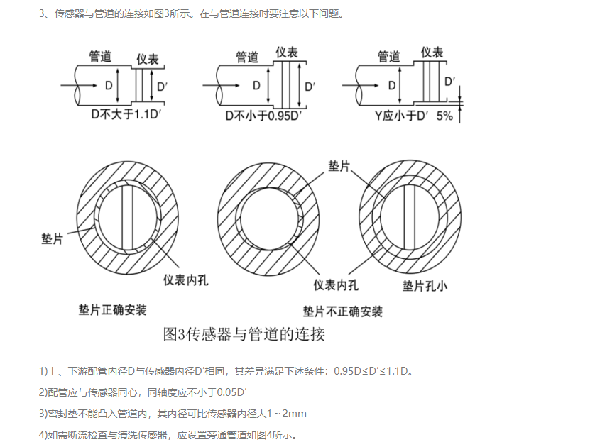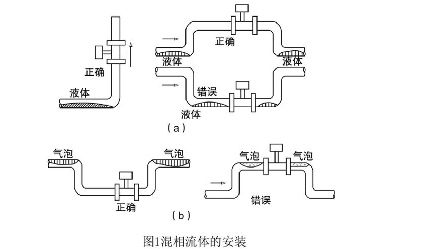 1、涡街流量计可安装在室内或室外。如果安装在地下井里,有水淹的可能,要选用潜水型传感器。传感器在管道上可以水平、垂直或倾斜安装,但测量液体和气体时为防止气泡和液滴的干扰,安装位置要注意,如图1所示。