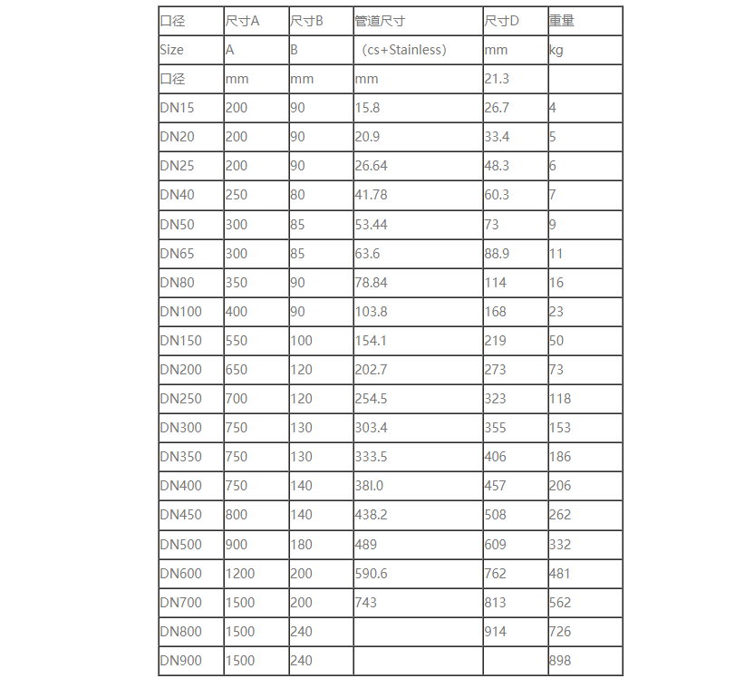 1、口径(单位: mm)