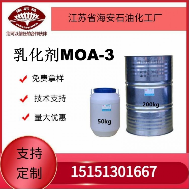 MOA-3易溶于油及极性溶剂中,水中呈扩散状,具有良好的乳化性能,作w/o型乳化剂,用于矿物油、脂族溶剂的乳化,聚氯乙烯塑料溶胶的降粘剂,在化纤油剂中广泛使用,MOA-3是生产AES的主要原料