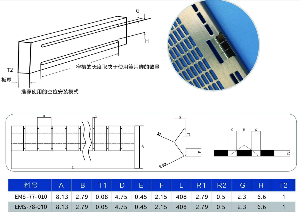 EMS-77-010是槽安装铍铜簧片,每一节都是一样的,适合于各种槽安装的场合,这种产品可用于接地和EMI屏蔽,EMS-77-010金属簧片具有以下特点: