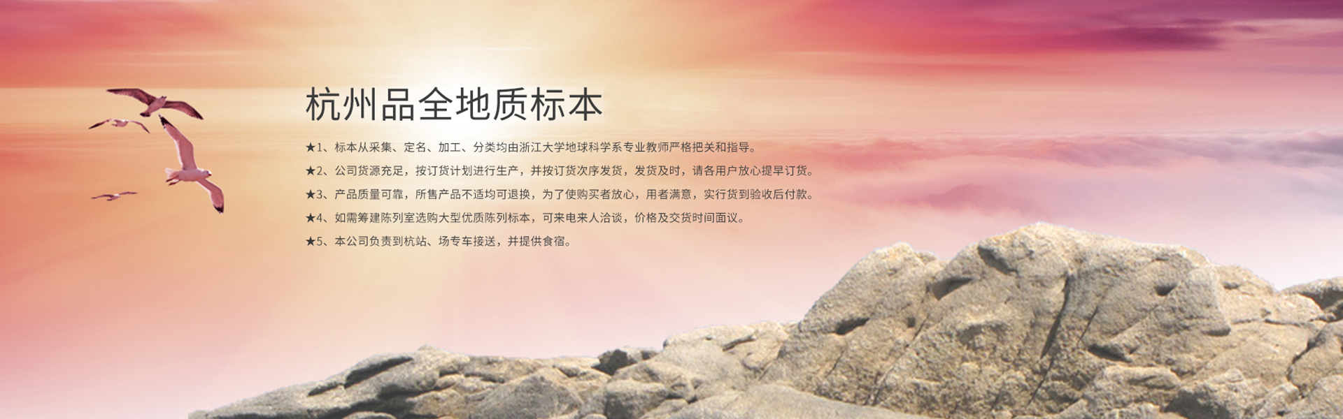 杭州品全地质标本(原浙江大学地质标本),是专业生产经营地质教学标本的企业。主要经营三大类岩石标本,各种类型矿物标本,各门类古生物化石标本、大型观赏展览陈列标本。1979年创办至今,常年组织专业技术力量,奔赴全国各地,采集各种标本,标本剖面标准、定名准确、品种齐全、特征明显、和教学大纲衔接密切,专为全国各大专院校、科研、地勘、博物馆等单位,提供教学,观摩之用,所售标本获客户“质量可靠,价格公道”的美好评价, 另承接相关单位代加工光片、薄片业务。欢迎广大用户来电来人洽谈订货,我具以下特点:★...