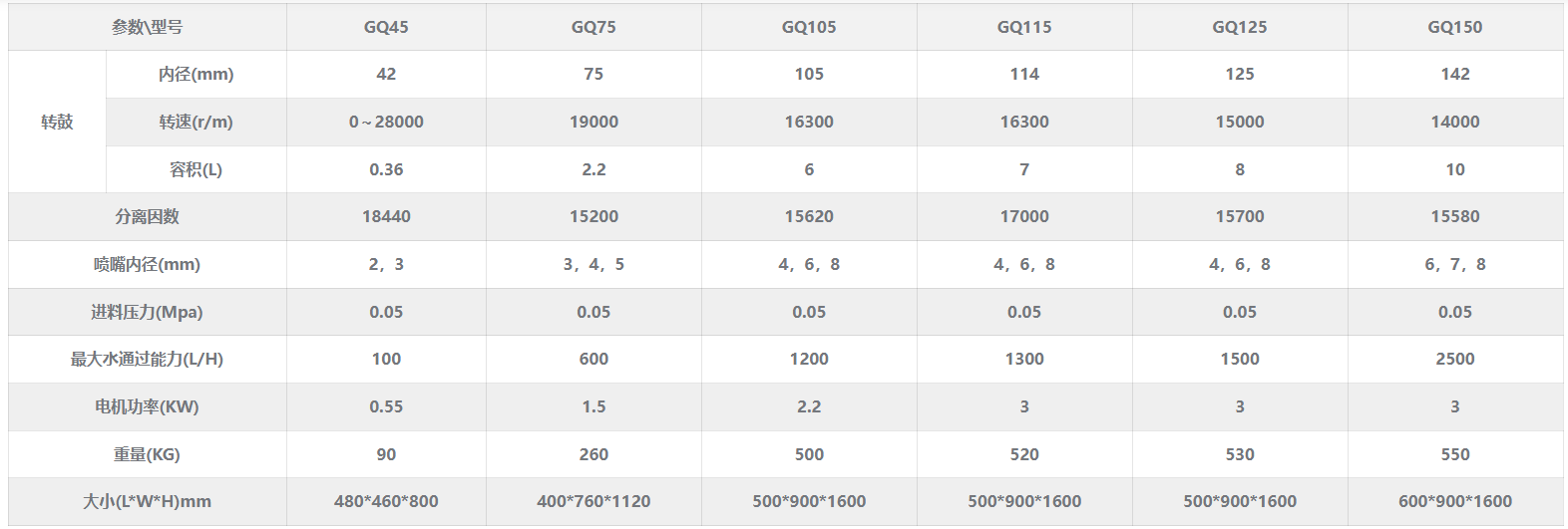 生物型管式离心机组成包括机身、传动系统、转鼓、集液系统和进液系统等主要部分。其中,转鼓的容积和离心力是客户选型中的重要参考因素,我公司生产的GQ150型号的管式离心机,转速为14000rpm,离心力为15580g,转鼓容积10L,GQ115型号管式离心机,转速为16300,离心力为17000g,转鼓容积为7L,选型时可根据发酵液的固体浓度和要达到的流量来选择适合的型号。