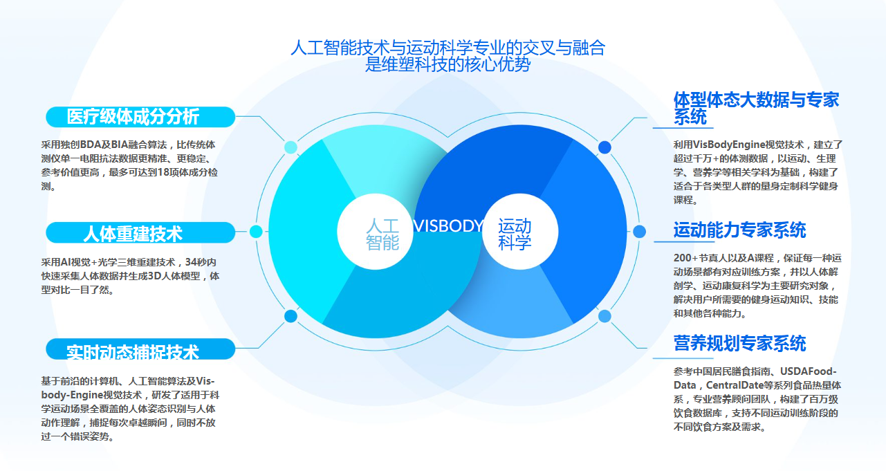 维塑科技所完善的科学运动中心暨智能化体融合解决方案,通过体测仪助力社区体融合方案快速实施,实现智能与无人化,可自动引导群众完成身体状态评估、运动计划定制以及带有反馈的运动训练组合而成的有效闭环方案,积极倡导健康生活方式,提高全民健康意识和健康生活方式。目前已完善落地包括东莞智能健身公园榆林市榆阳区体育训练中心,西安市碑林区全民体育中心等在内的100多家机构。